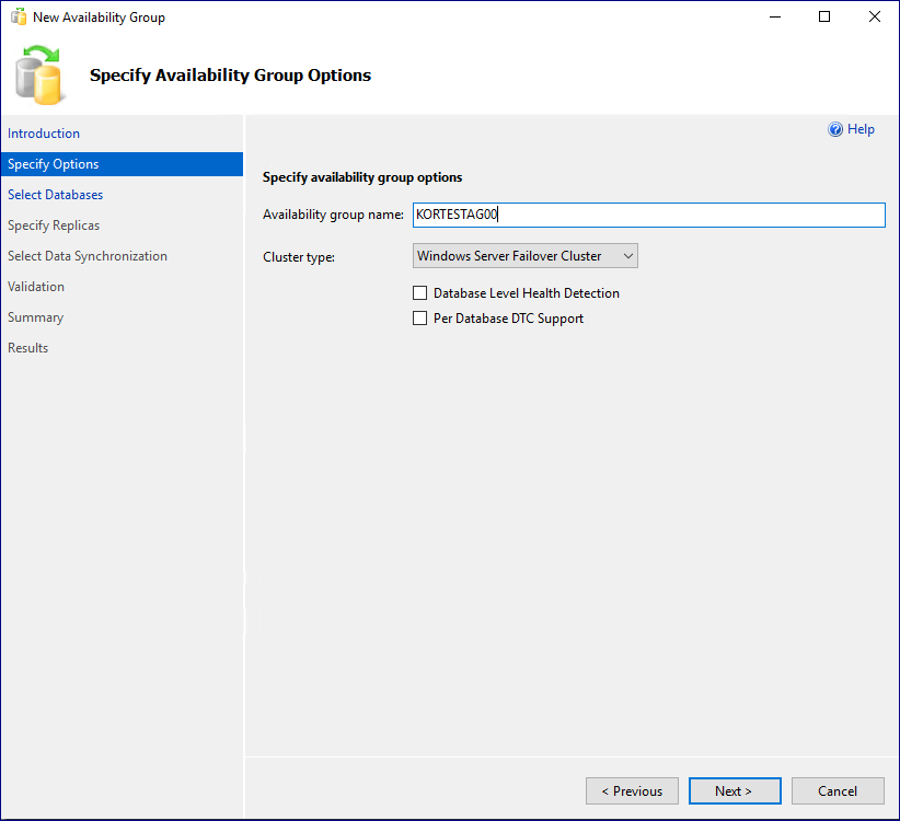7. Alwayson Group 이름 및 클러스터 유형 선택. 가용성 그룹 이름을 입력하고, 유형으로는 'WSFC(Windows Server Failover Cluster'를 선택합니다.