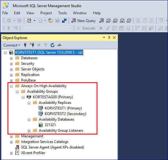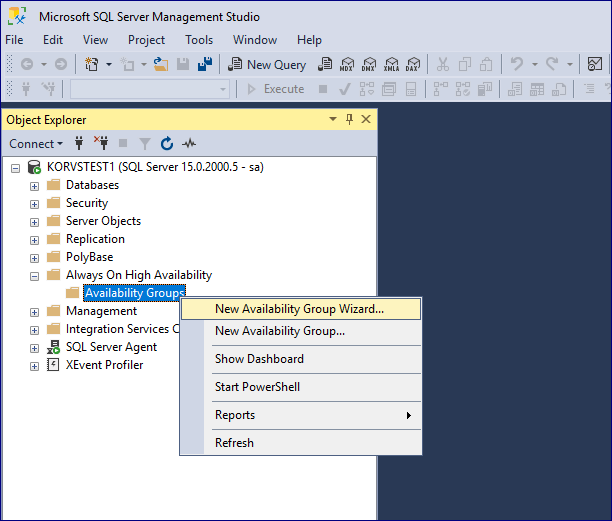 6. SQL 서버 접속 및 Alwayson 구성 마법사 실행. SSMS(SQL Server Management Studio)를 실행하고 주 서버에 연결합니다. [Always On High Availability] 위치에서 Alwayson 생성을 시작합니다.