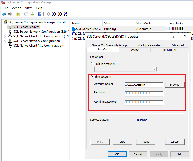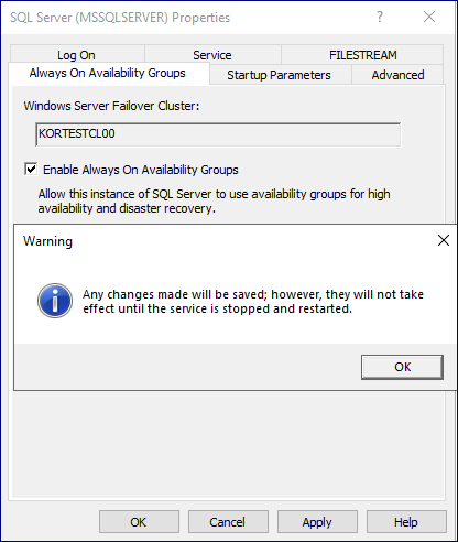 5. Alwayson 기능 활성화. 각 서버의 SQL 구성 관리자를 실행하여 SQL 서비스를 시작할 계정 정보를 입력합니다. 이때의 계정은 양쪽 서버에 동일한 권한이 있는 계정으로 설정합니다. 계정 입력 후, Alwayson 기능을 활성화하고 SQL 서비를 재시작 합니다.