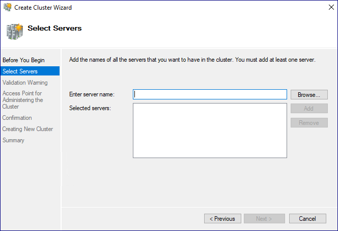 2. 클러스터 노드(Node) 추가. 클러스터의 구성원이 될 노드들을 추가합니다. [Browse]를 통해 서버를 검색해서 추가합니다.