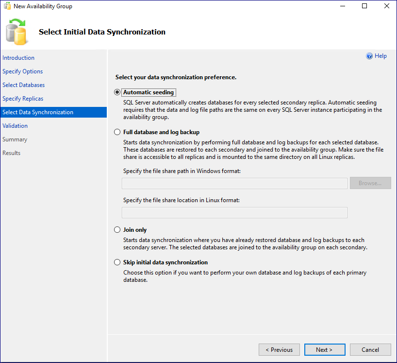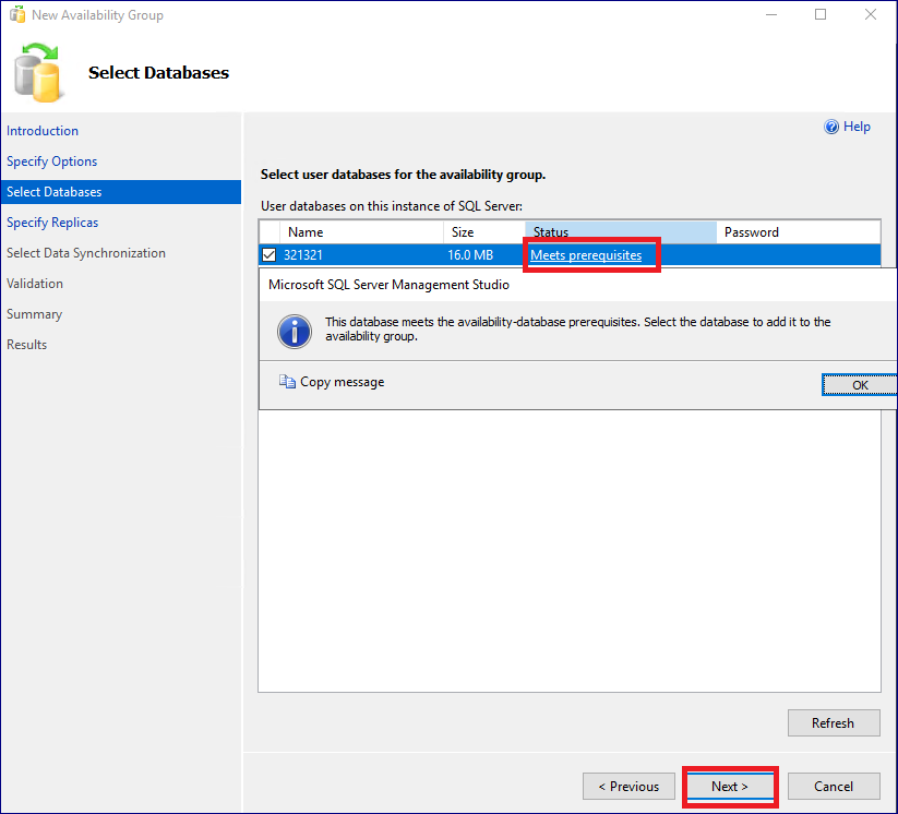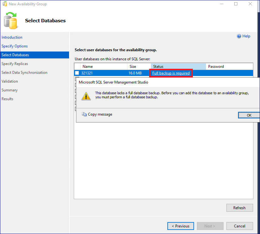 8. 데이터 베이스 선택 및 데이터베이스 백업. 가용성 그룹에 포함할 데이터 베이스를 선택합니다. 가용성 그룹 포함 전, Full 백업이 필요하며 진행하지 않으면 포함할 수 없습니다. 백업을 먼저 진행하고 이어서 진행해보겠습니다.