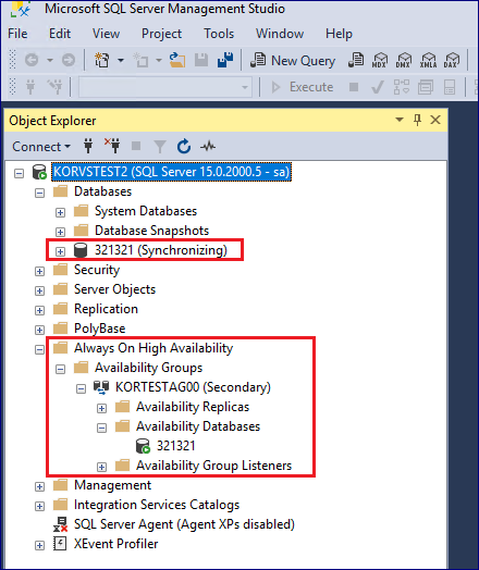 13. 복제 확인. 구성 완료 후, [Always On High Availability] 하위로 가용성 그룹 및 각 노드, 데이터베이스가 추가됐는지 확인합니다. 마찬가지로 보조 서버에서 가용성 그룹 구성을 확인하고 데이터베이스 동기화 상태를 확인합니다.