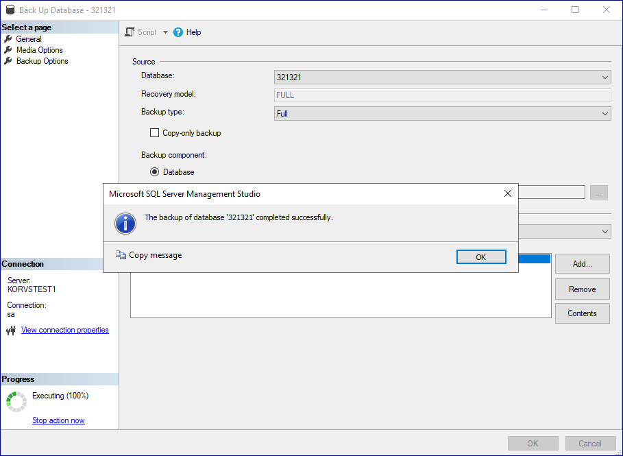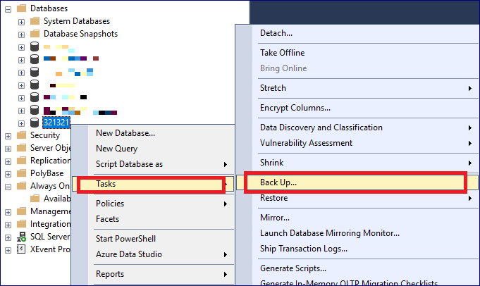 9. 데이터베이스 백업. 가용성 그룹에 추가할 데이터 베이스를 우클릭 하여 [Tasks] - [Back up...] 순으로 진행합니다. 백업 경로는 필요에 따라 변경하고 지금은 기본으로 두겠습니다.