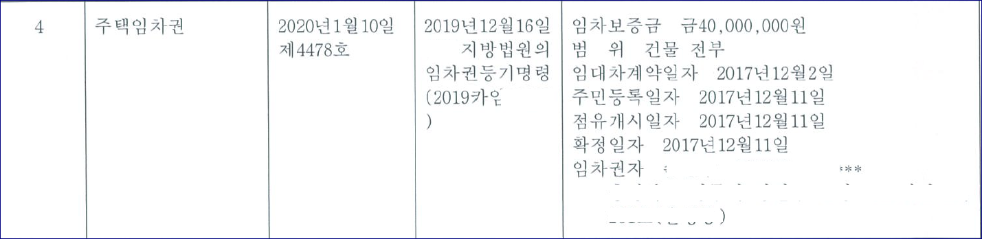 임차권등기명령 신청으로 완료가 되면 부동산등기부등본에 해당 내용이 기재됩니다. 보증금, 계약일자, 확정일자, 임차권자 정보 등.. 이후에는 해당 집에서 완전 퇴거하고 새로운 집으로 전입신고를 하더라도 대항력이 유지됩니다.