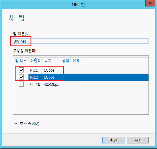3. NIC 구성. NIC Team의 이름을 입력하고 포함하고자 하는 NIC 들을 선택합니다. 확인을 누른 후, 활성화까지 기다립니다. (약 1분 이내)