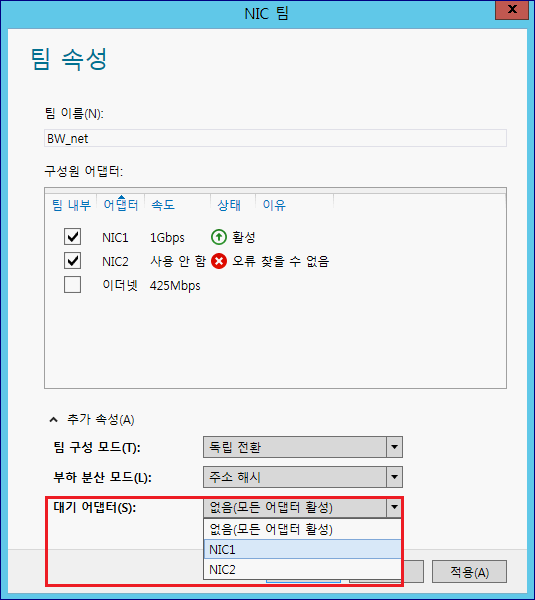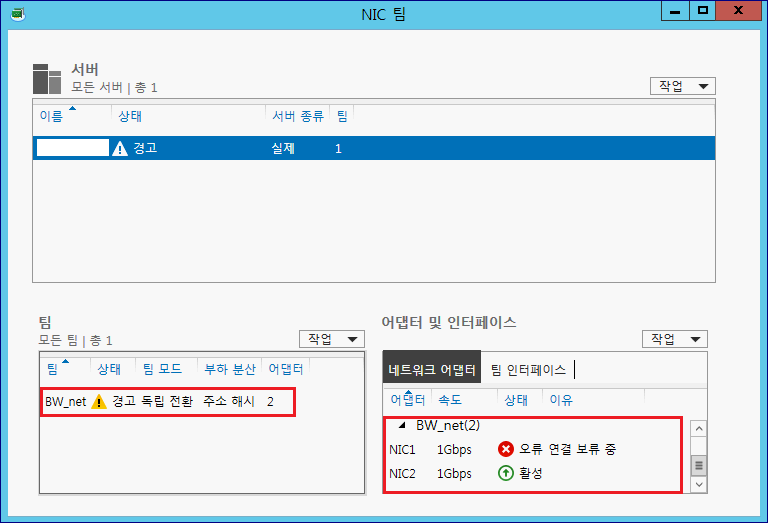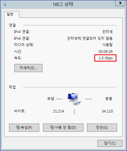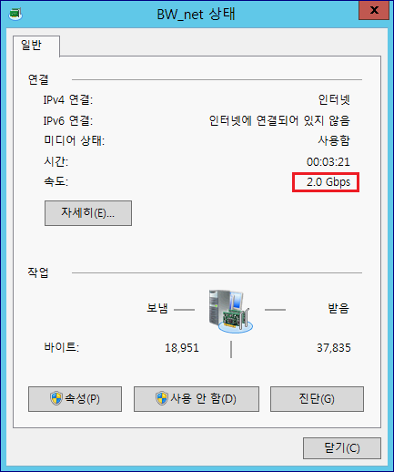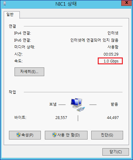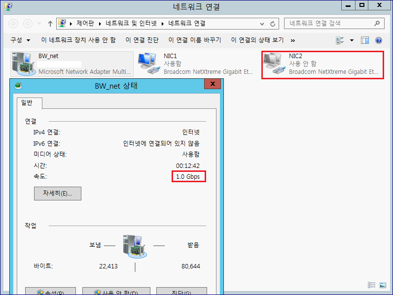 5. 장애 테스트. Team 구성 NIC 중 1개를 내려보겠습니다. 대역폭은 줄었지만, Team NIC는 여전히 활성화 된 상태인걸 확인할 수 있습니다.