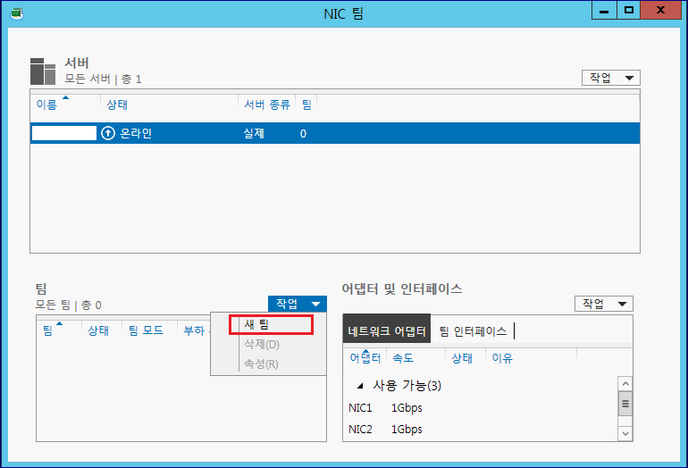 1. NIC Team(NIC 팀) 실행. 서버 관리자 > 로컬 서버 > NIC 팀을 눌러서 해당 기능을 실행합니다.