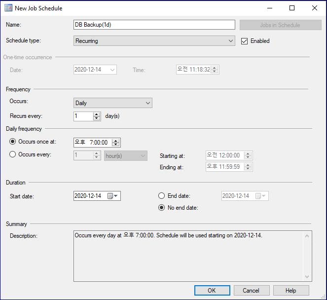 저는 매일 1회 백업, 보관 기간은 1일로 설정해보겠습니다. 다음날 새로운 백업이 생성되고, 기존의 1일이 경과한 백업 데이터는 사라집니다.