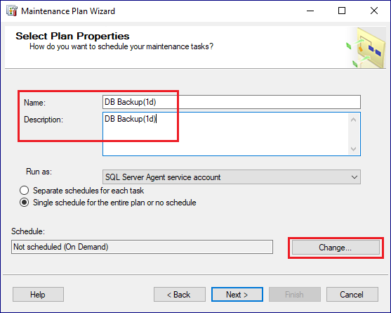 2. 계획 이름 및 스케줄 설정. 이름 및 설명을 입력하고 백업 스케줄(백업 시작 시간)을 설정합니다.