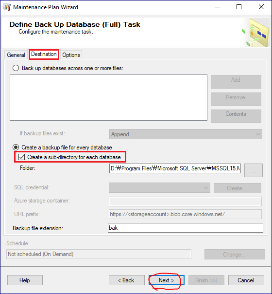 4. 백업 설정. 백업 작업 관련하여 대상 데이터베이스, 저장 위치를 설정합니다. '각 데이터 베이스의 하위폴더 생성' 옵션을 설정하면 깔끔하게 관리할 수 있습니다.
