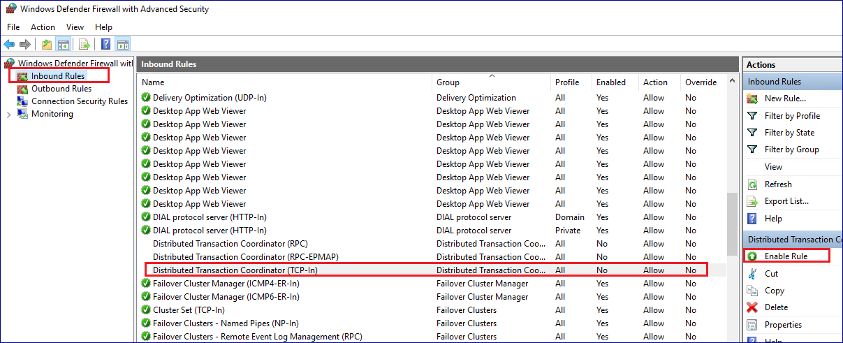 4. 방화벽 설정. 방화벽 고급 설정에서 [Inbound Rules], [Outbound Rules] 에서 각각 'Distributed Transaction Coordinator(TCP-In)/(TCP-Out) 항목을 활성화 합니다.