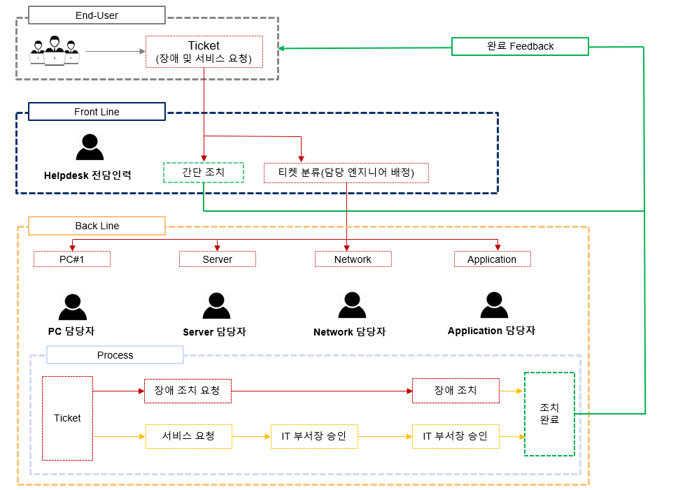 헬프데스크 운영 방식은 간단합니다. 사용자(End-User)로부터 서비스에 대한 요청을 받고 적절한 절차에 따라 조치/지원하면 됩니다.
