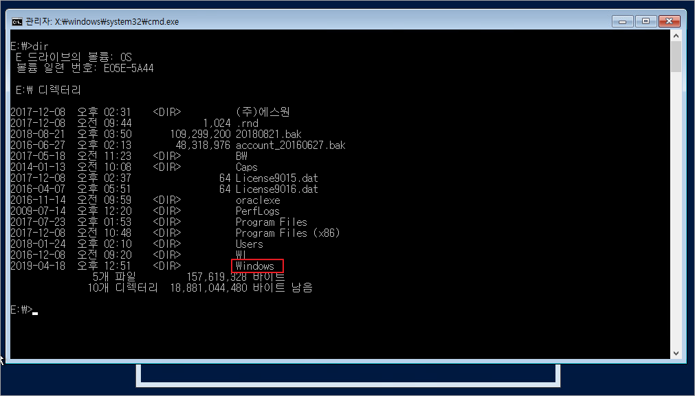 3. 경로확인. C: D: E: 드라이브로 경로를 이동하면서 'Program Files', 'Program Files (x86)', 'Windows' 폴더가 위치한 드라이브를 찾습니다. (저의 경우엔 E: 드라이브입니다.)