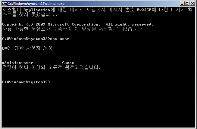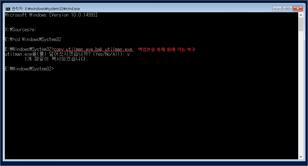 (3) copy utilman.exe.bak utilman.exe | 백업본으로 원래 기능 복구