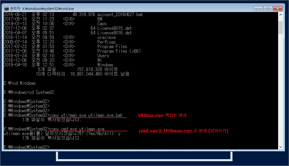 E:\Windows\System32> copy utilman.exe utilman.exe.bak **utilman.exe 는 '접근성' 기능 실행 파일