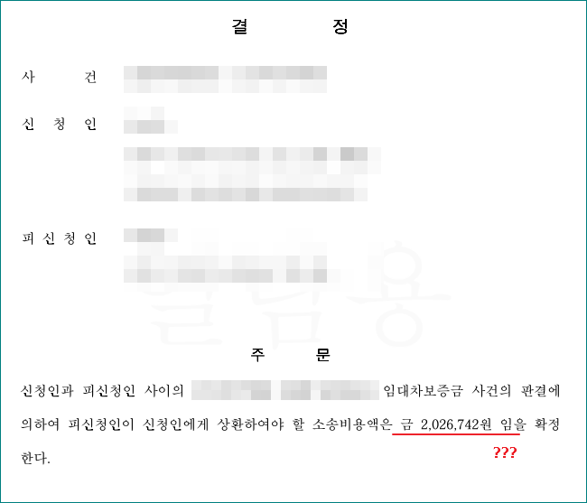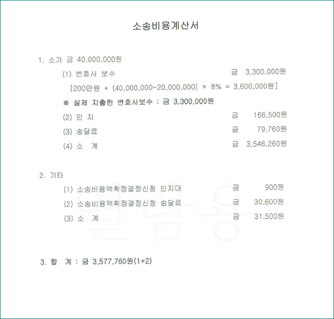 여튼... 많이 조정된 금액으로 확정받았는데요, 기분은 나쁘지만 그나마 변호사 비용을 실제 계약금액이 아닌 최대 인정금액에서 1/2로 계산해준걸 다행이라고 위안삼았습니다. (실제 지출금액 = 3,300,000원 / 최대 인정금액 = 3,600,000원)