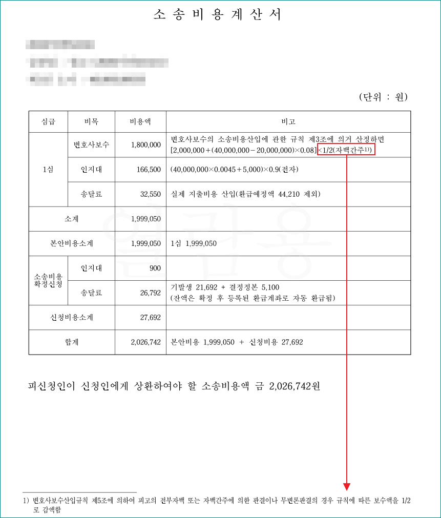 제가 신청한 금액에서 무려 약 1,500,000원이 조정됐습니다. 그 이유가 자백간주라는 명목 하에 변호사 비용을 절반 밖에 인정해주지 않았기 때문입니다.