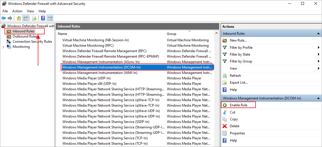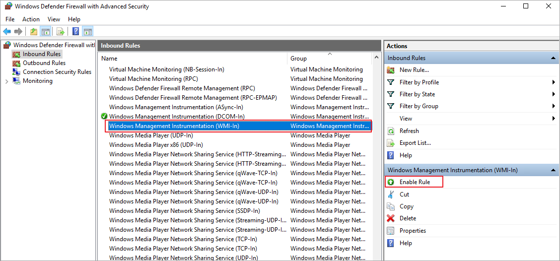방화벽의 상태를 점검하고, WMI 관련 정책을 활성화홥니다. (Enable)
