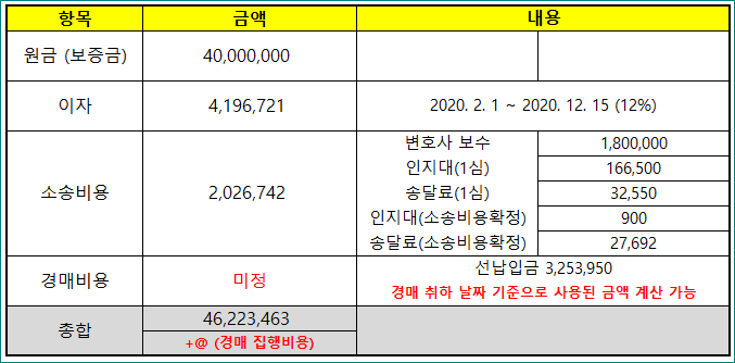 경매비용 - 강제 경매 신청에 따른 선납입금(예치금) 중, 사용 금액 (합의 날짜 기준, 경매계 전화 확인 가능)