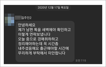 합의를 위해 몇 번의 약속을 잡았었으나, 집주인 쪽에서 당일이나 하루 전 날에 계속해서 미뤄왔습니다. 거기다가 한 번 미루면 연락도 일주일 뒤에나 오는게 많이 짜증났습니다.