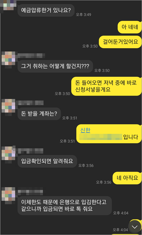 집주인 내외가 사무실을 진짜로 방문했고!!! 긴장되는 순간입니다. 카톡 대화의 상대방은 법무법인 담당자님이고, 중간 입장에서 몇가지 사항에 대해 체크를 진행했습니다. 보시면 알겠지만 예금압류 해제에 대해 콕 집어서 이야기 한 것으로 보입니다.