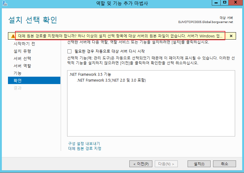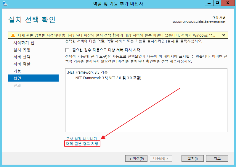 2. 대체 경로 지정. [대체 원본 경로 지정]을 선택 하여, 설치 파일의 상세 경로를 지정합니다.