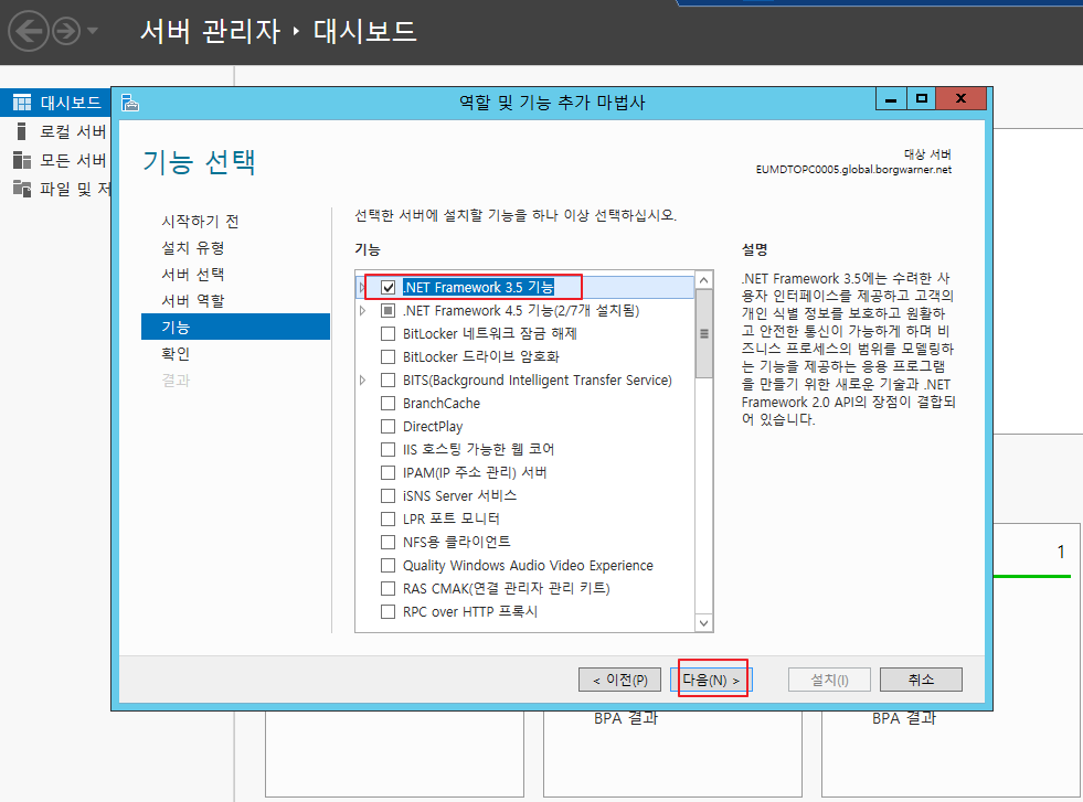 1. 역할 및 기능 추가. [서버관리자] > [ 역할 및 기능 추가] 를 실행합니다. 이후 [.Net Framwork 3.5 기능]을 선택하고 다음을 눌러줍니다.