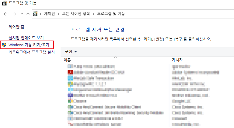2. [Windows 기능 켜기/끄기]. 좌측의 [Windows 기능 켜기/끄기] 탭을 선택합니다.