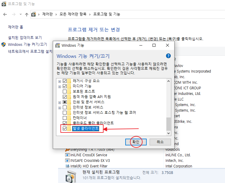 3. Telnet 설치. Windows 기능 중, 아래 부분에 [텔넷 클라이언트] 기능이 있습니다. 체크 후. [확인]을 누릅니다.