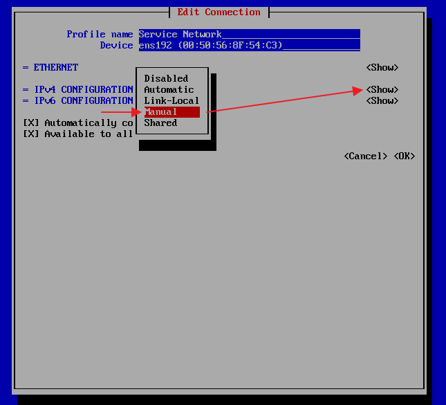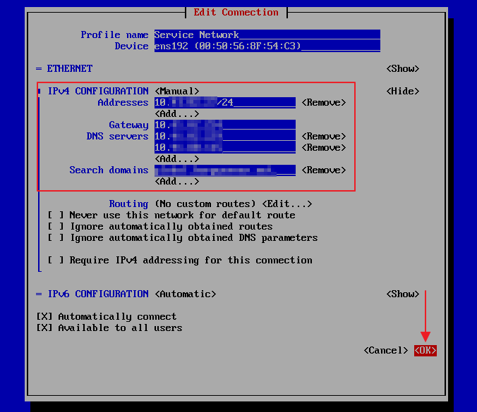 3. 네트워크 구성(DHCP). NIC 선택 후 관리상 보여지는 [Profile name]을 수정하고 [Automatically connect] 옵션을 활성화 합니다. (방향키로 이동 후, 스페이스 바) IPv4 및 IPv6는 기본적으로 자동 구성(DHCP)으로 되어 있기 때문에, 자동 연결 옵션만 활성화 해줍니다.
