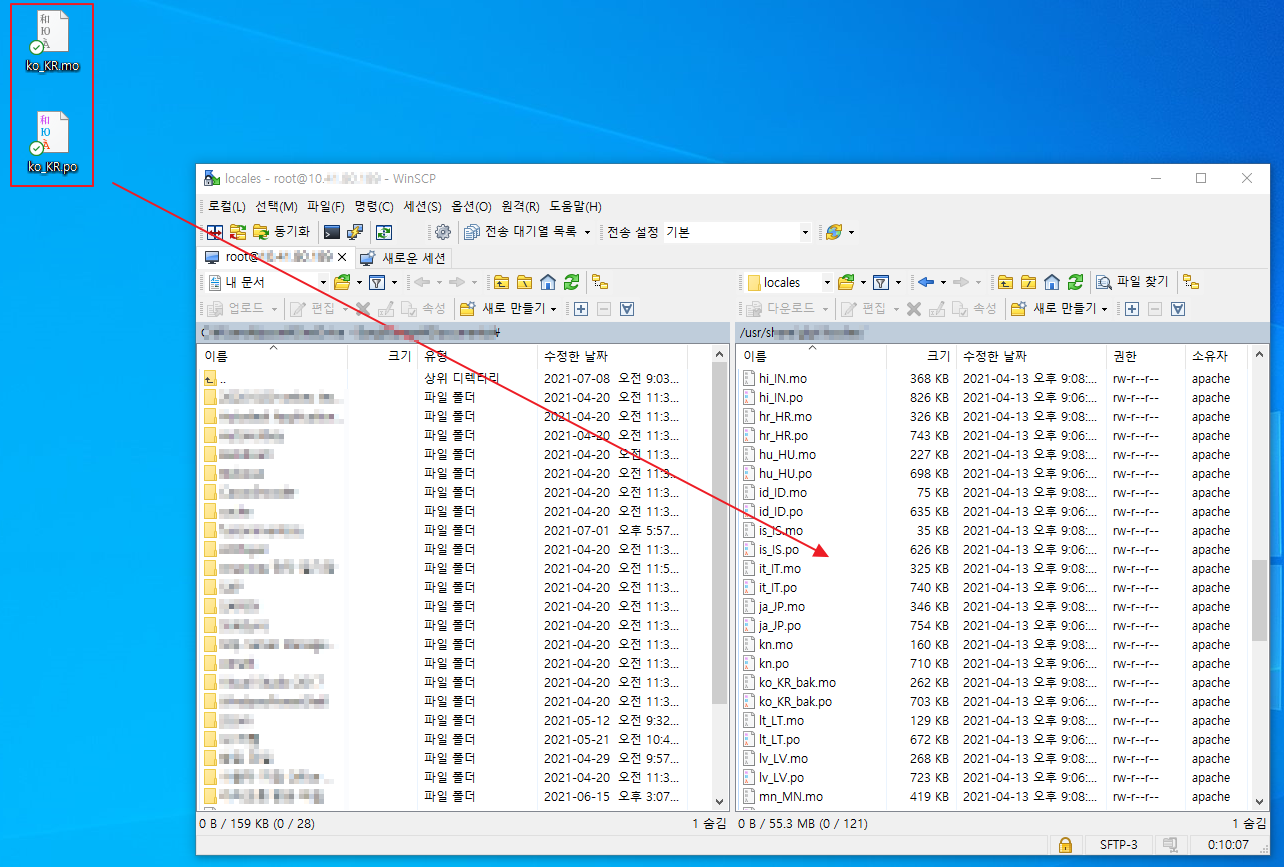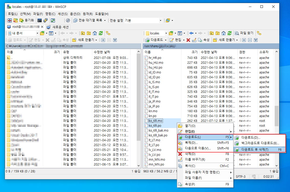 3. 파일 관리(다운로드 및 삭제). 연결 후, 우측의 대상 서버의 디렉토리가 보여지며 윈도우 탐색기 형태로 폴더 및 파일을 확인할 수 있습니다. 원하는 경로의 파일들을 우클릭하여 다운로드/복사/삭제/이름 변경 등의 기능을 사용할 수 있습니다.