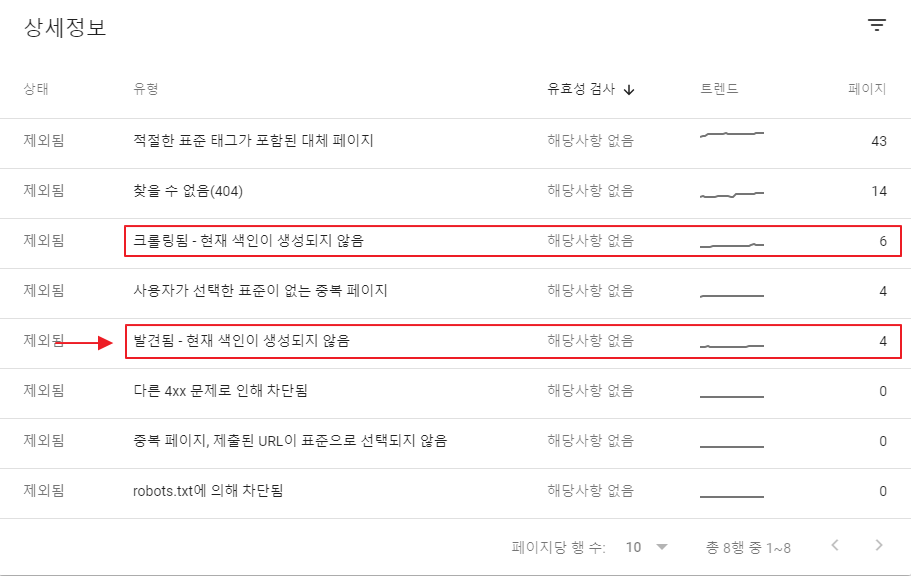 4. 리포트 확인. 추가로 검색이 되지 않는 글들이 더 있는지 '색임 생성 범위'를 통해 보고서를 확인합니다. 좌측의 '색인 생성 범위'를 누르고 '제외됨'을 선택하여 '현재 색인이 생성되지 않음' 카테고리를 선택해서 글들을 확인합니다.