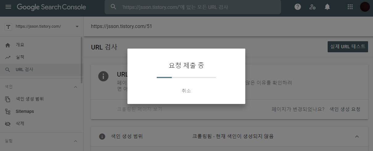 3. 색인 생성 요청. 검색 결과에서 바로 '색인 생성 요청'을 눌러서 수동으로 크롤링(글을 탐색하여 색인에 추가하는 것)을 요청합니다.