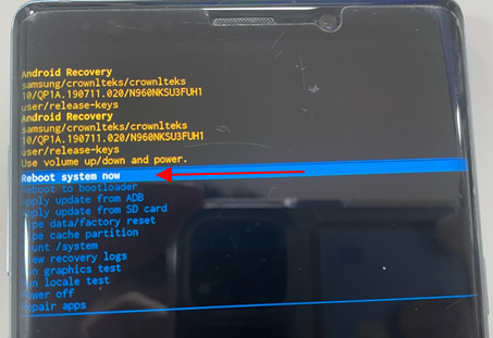3. 재부팅. 초기화 완료 시, 화면 하단으로 완료가 표기되며 상단에는 재부팅할 수 있도록 메뉴가 표시됩니다. [Reboot system now] 메뉴를 선택하여 재부팅을 진행합니다.