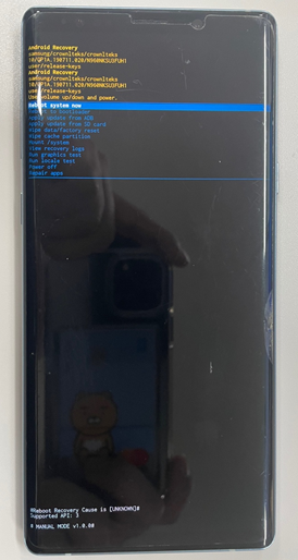 1. 복구 모드(리커버리 모드) 진입. '전원' + '빅스비' + '볼륨(+)' 버튼 세개를 동시에 약 2~3초간 눌러서 복구 모드에 진입합니다.