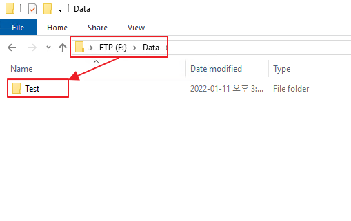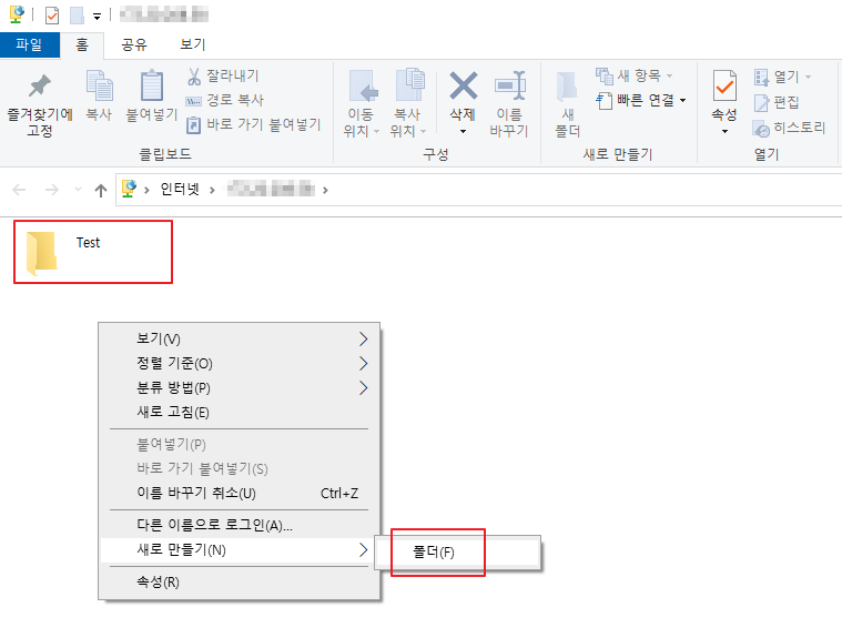 인증창이 사라지면 정상 접속 된 것이며, [새로 만들기] > [폴더]를 통해 FTP 경로에 폴더 생성이 가능한지 확인합니다.
