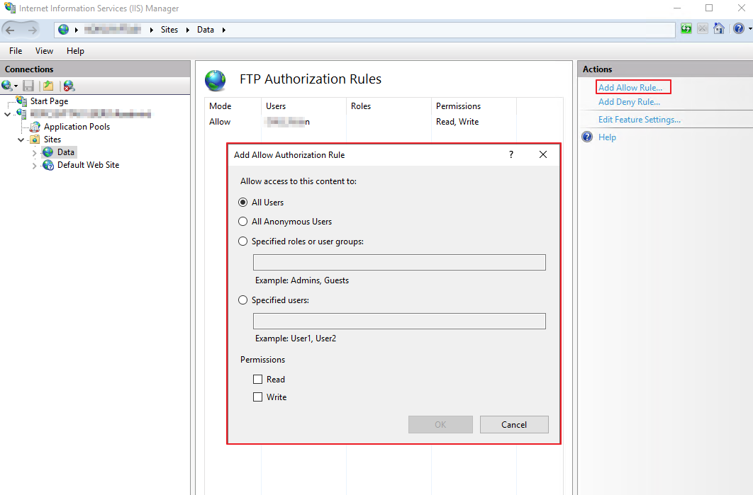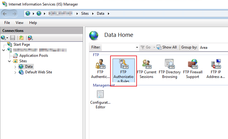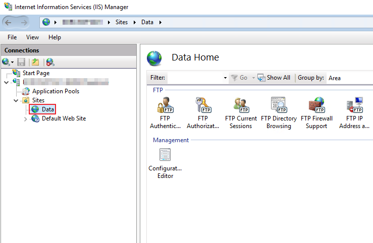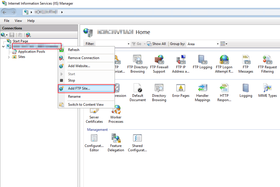 2. FTP 서비스 추가. IIS 연결을 우클릭하고 [Add FTP Site...]를 통해 FTP 구성을 시작합니다.