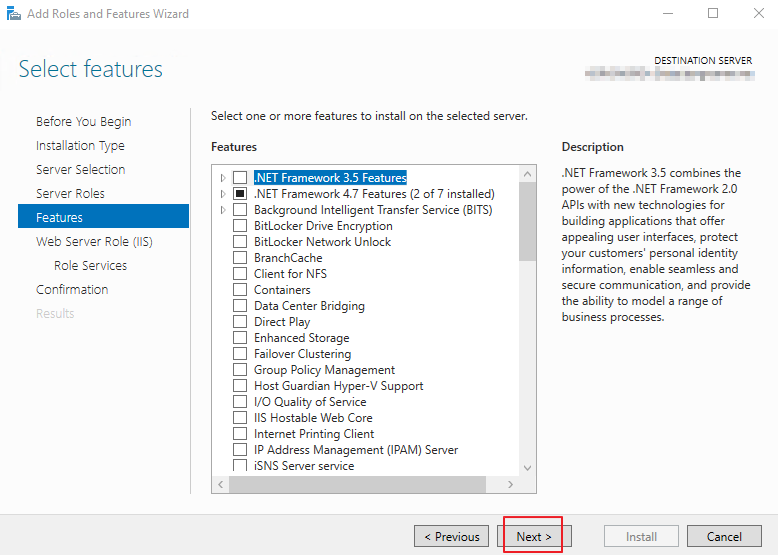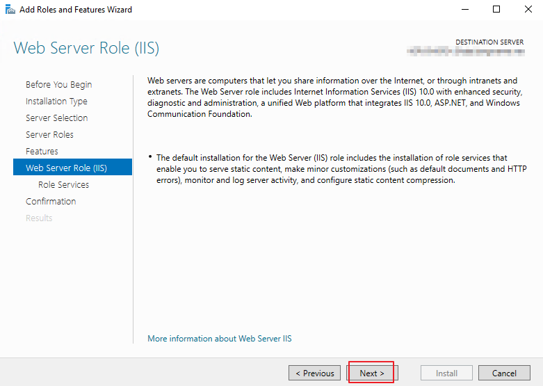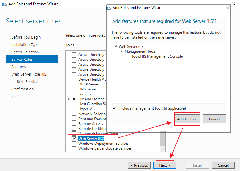 2. IIS 설치. [Web Server (IIS)] 역할을 선택하고 설치를 진행합니다. 역할 선택 시, 팝업되는 기능 추가 관련해서는 추가 버튼을 눌러주고, 다음 화면에서 나오는 기능 추가 화면은 바로 넘겨줍니다.