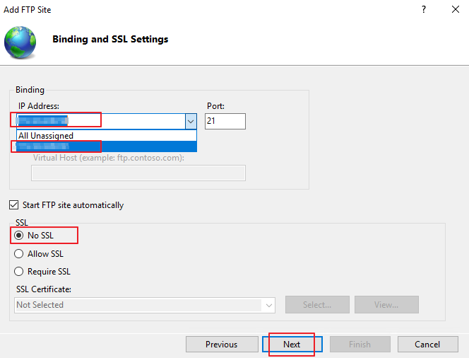 4. 접속 주소 및 보안 설정. [IP Address]는 서버의 기본 IP 주소로 지정하고 [SSL 인증] 관련, 사용 안함으로 설정합니다.