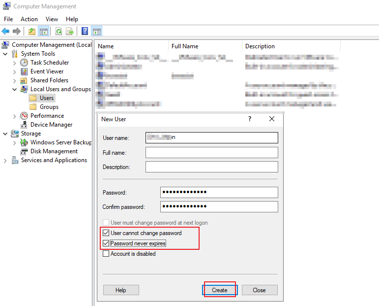 1. [컴퓨터 관리] 실행. [컴퓨터 관리]를 실행하고 [로컬 사용자 및 그룹] > [사용자] 메뉴에서 계정을 생성합니다. 서비스 계정이기때문에 [사용자가 암호를 변경할 수 없음], [암호 사용 기간 제한 없음] 옵션을 설정합니다.