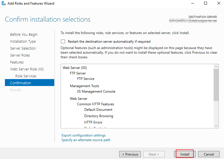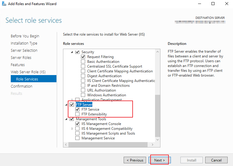 3. 서비스 설치. [Web Server (IIS)]에 대한 서비스 구성을 설정합니다. 여기서 FTP 서비스를 체크하여 설치를 진행합니다.
