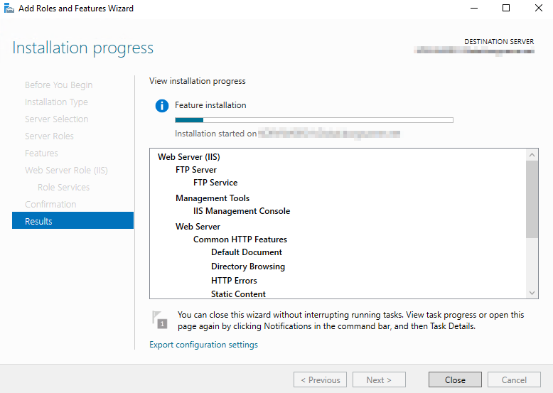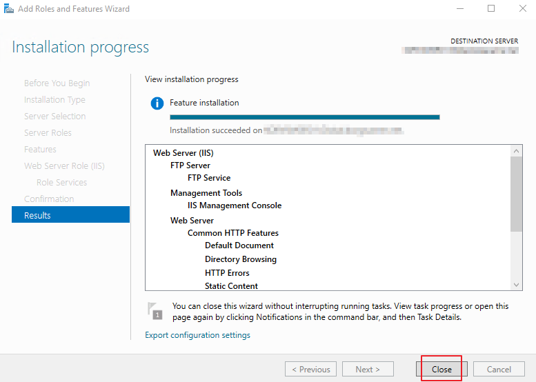 4. 설치 완료. 약 5분 정도 소요되며, 이후 [Server Manager] 콘솔을 종료합니다.