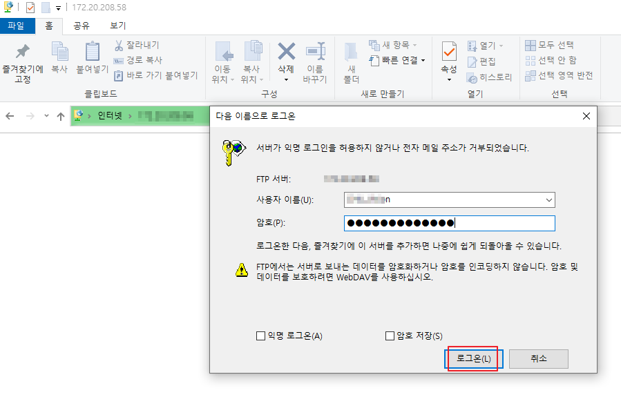 앞서 만든 FTP 전용 계정을 입력합니다.