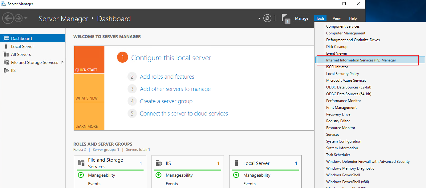 1. 'IIS 관리자' 실행. [Server Manager] > [Tools] > [Internet Information Services (IIS) MAnager] 순으로 'IIS 관리자'를 실행합니다.