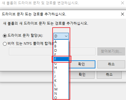 2. 드라이브 문자 삭제. 대상 드라이브 우클릭 후, [드라이브 문자 및 경로변경]을 선택합니다. 이후 할당되어 있는 문자를 선택하고 삭제합니다.