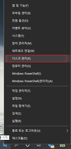1. 디스크 관리. 해당 파티션을 조작하기 위해 '디스크 관리'를 실행합니다. 실행은 다양한 방법으로 할 수 있습니다.