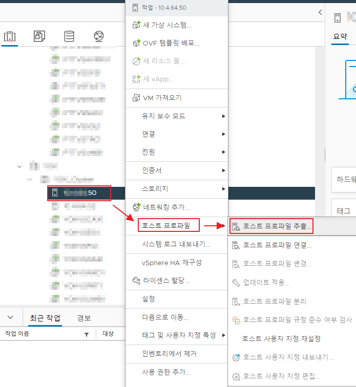 1. vCenter 접속. vCenter 접속 후, 비밀번호를 분실한 호스트 서버의 호스트 프로파일을 추출한다. 임시 파일이므로 이름은 대충 적당히.