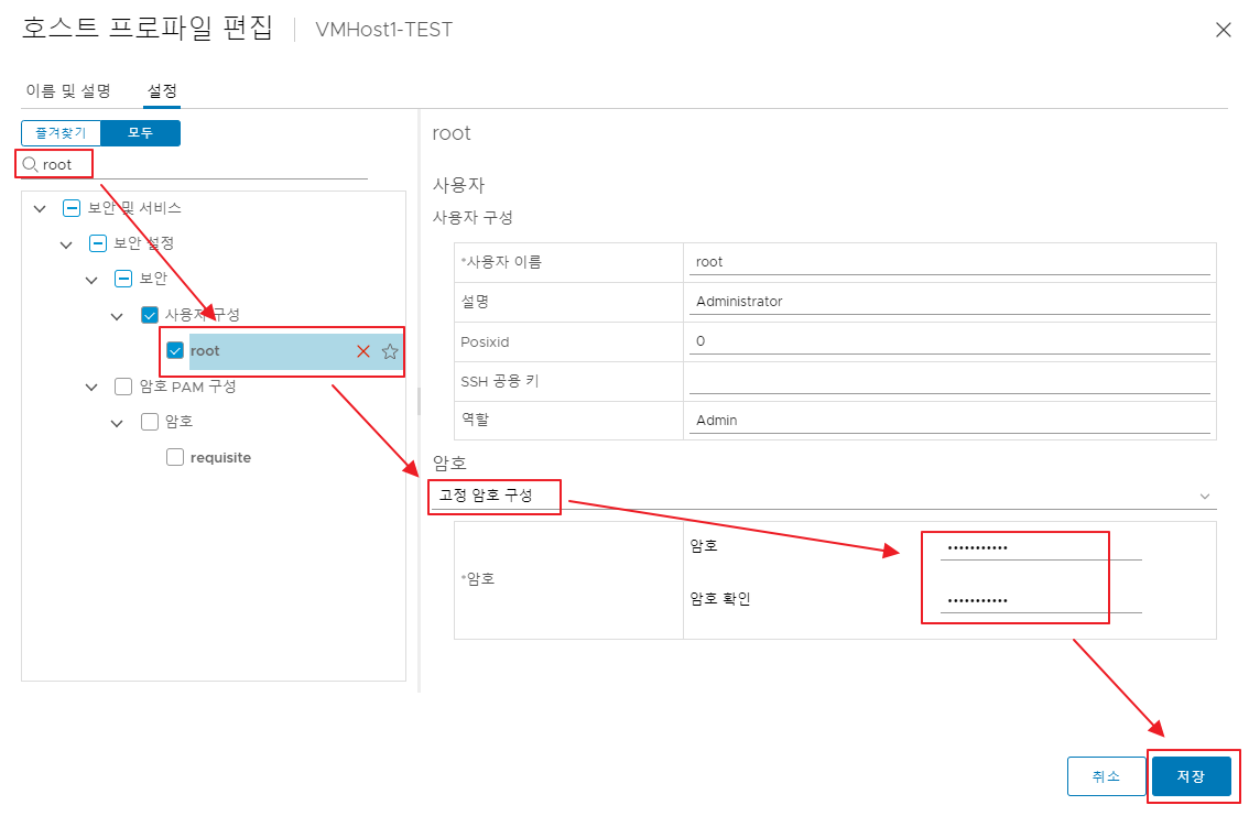 root 부분만 검색/체크 후, [고정 암호 구성] > [신규 암호 입력] > [저장]