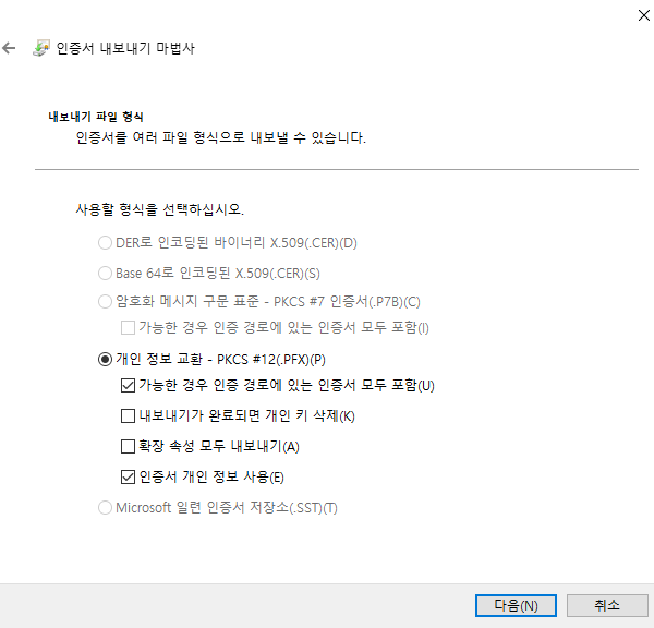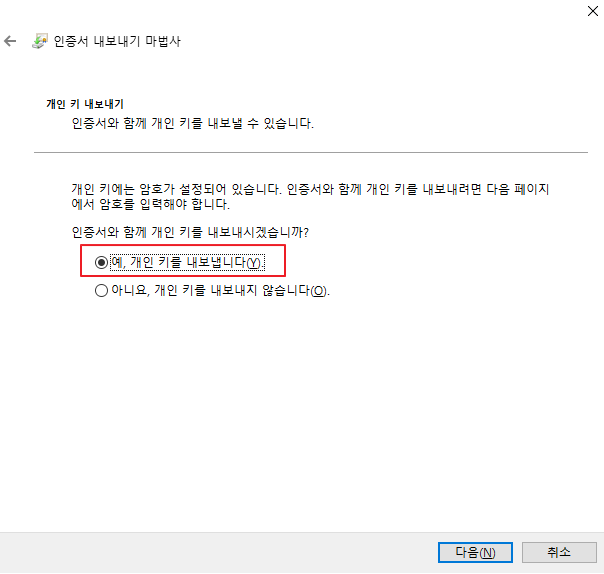 3. 개인키 포함 옵션 선택 후, 개인키 설정