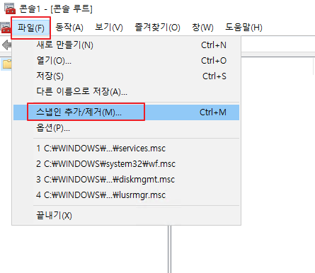 1. mmc 관리 콘솔, [인증서] 스냅인 추가